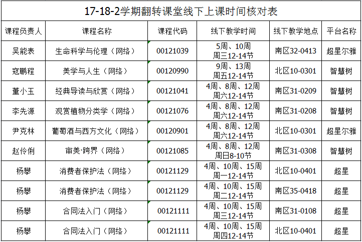 3. 本学期部分网络课程实行翻转教学(即线上线下混合式教学),翻转课程线上教学部分均在相应平台授课,线下教学时间请见下图,选择翻转课程的同学务必准时参加线下教学,并牢记课程修读及考核要求。