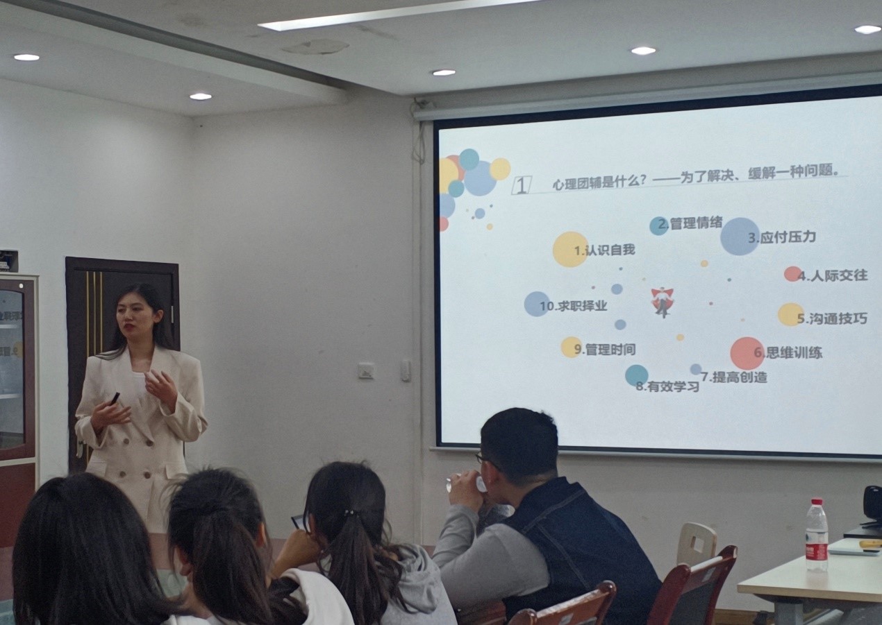 此外,杨希还讲授了开展团辅活动的技巧、方法和活动开展的注意事项,强调了活动前期的规划和准备要充足,并注意团辅位置安排等细节问题,以保证活动顺利进行;活动过程中要关注和照顾到每位同学的情绪,激发参与者的积极性;对于其他一些突发问题,如何进行应急处置等。最后,杨希对每个班级上交的心理团辅计划书做了点评,并给出了修改意见。
