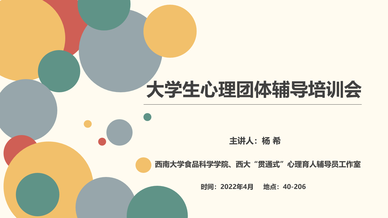 在本次培训中,杨希从心理团辅的定义、重要性、团辅方案的设计、团辅活动中领导者应该怎么做、突发团体事件的处理方式等五个方面进行介绍和讲解。