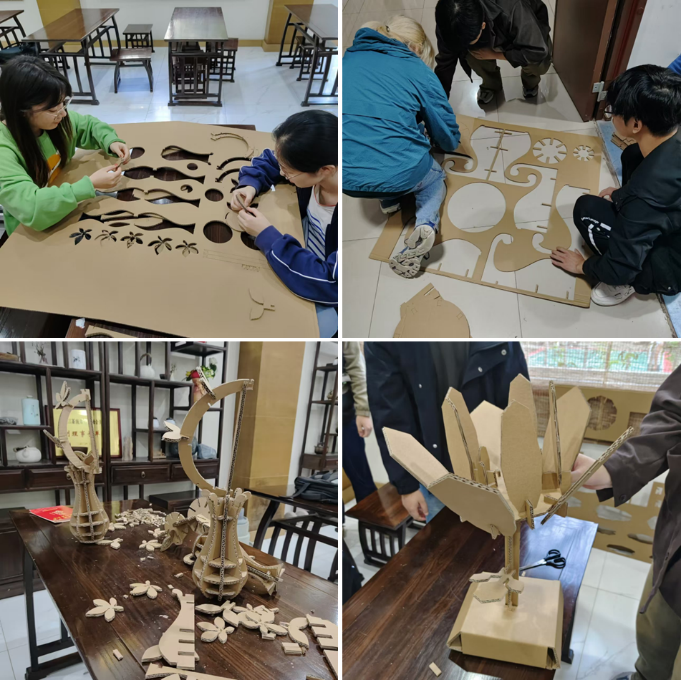 在活动过程中任丹老师特别强调了模切机的安全使用。在老师的指导下同学们学习了模切机的操作方法并在实践中严格遵守安全规程确保了活动的顺利进行。经过几小时的紧张工作造型独特、结构巧妙八角章鱼凳和花瓶呈现在大家面前。