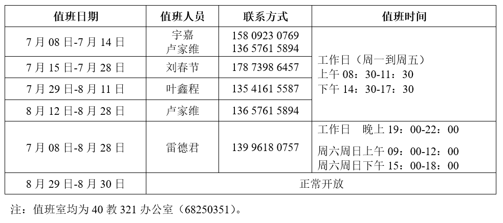 为保障暑假期间师生有序开展实验活动,jav图书馆 仪器设备共享服务平台及教学实验室正常开放。值班安排如下: